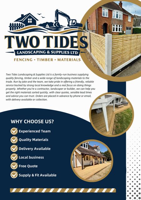 Two Tides Landscaping & Supplies Ltd is a family-run business supplying quality fencing, timber and a wide range of landscaping materials to the trade. Run by Jake and the team we take pride in offering a friendly, reliable service, backed by strong local knowledge and a real focus on doing things properly.